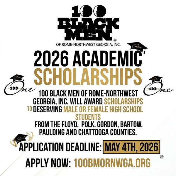 100 Black Men of Rome Northwest Georgia, Inc. will award academic scholarships to deserving male or female high school students from the Floyd, Polk, Gordon, Bartow, Paulding and Chattooga counties. Each recipient will receive scholarship which may be renewable each year while attending a college or an university.